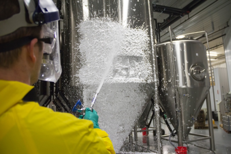 The same application principles used for chlorinated alkaline, alkaline, and acid cleaners also apply for sanitizers. By creating a foam product either for a cleaner, or in this case a sanitizer / biocide, one can delineate where a product has been applied while providing cling / retention time onto a vertical surface or even a ceiling. The foaming additives enable one to economically utilize a chemistry, be it a cleaner or in our case, a peracetic acid sanitizer.
