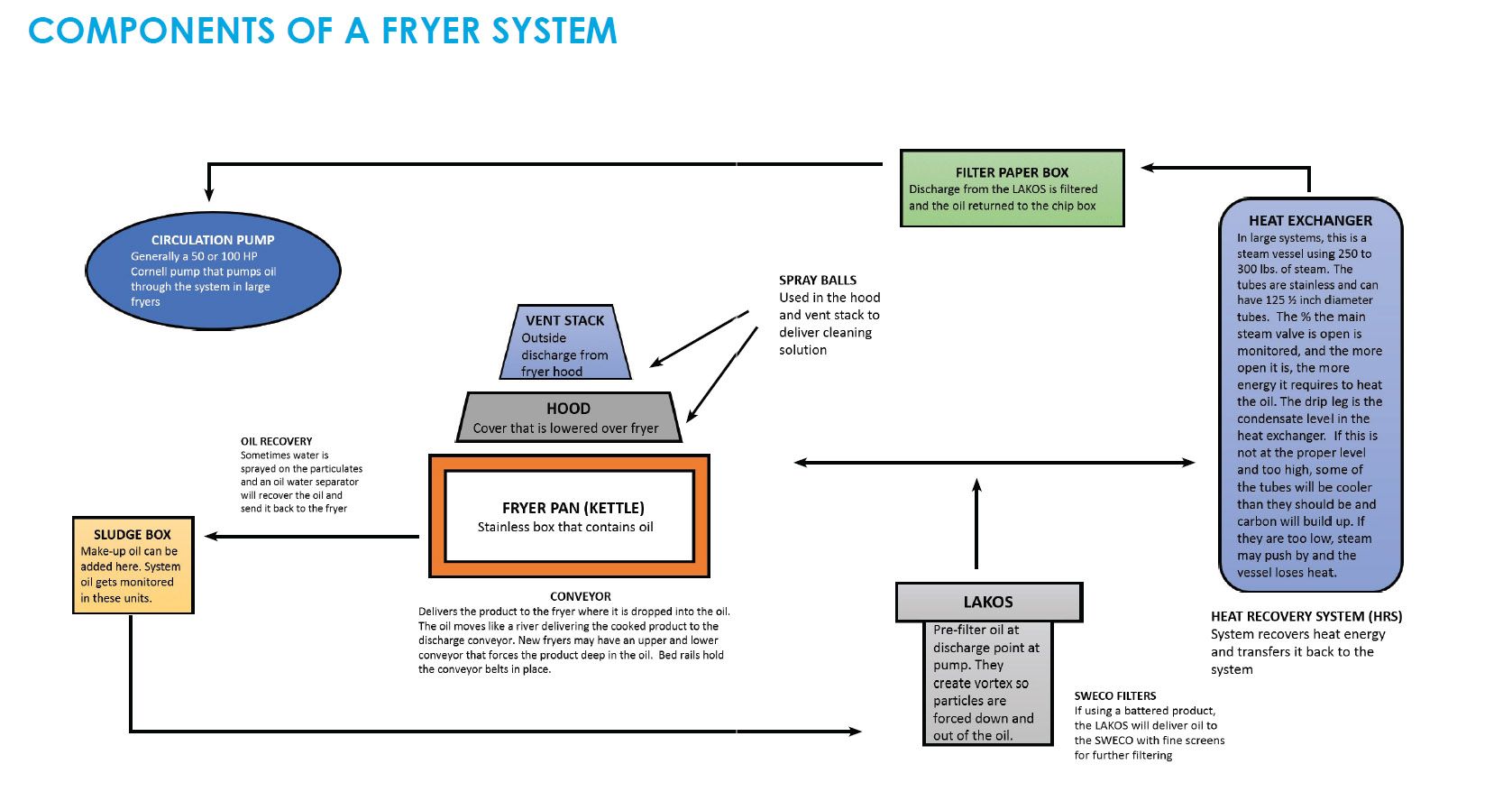 The proper preparation and execution of a food processing fryer requires a thorough comprehension of the sanitation principles utilized for all system components. Implementation of appropriate chemistries in concert with the design components of the system are key to creating a functional SSOP. These same principles are also applicable to all post-fryer processing equipment for product cross-contamination and contact issues that can and do occur.
