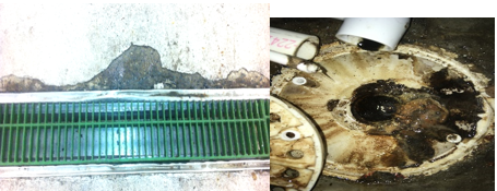 Issues include construction material corrosion when using carbon/mild steel, poor joint seals, poor/improper slope of the drain, and deteriorated concrete surrounding drain troughs.