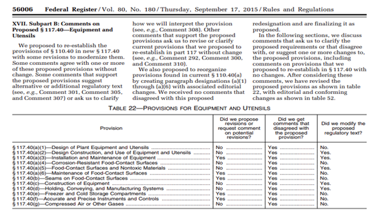 Below is the CFR 21 Table of Contents for Equipment & Utensils which covers many of the topics that SQF and BRC address: