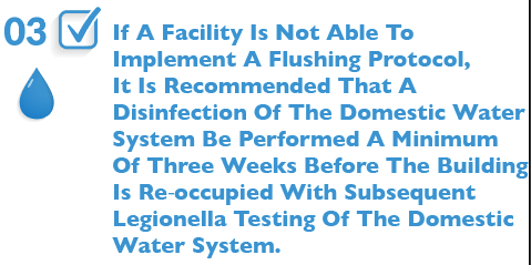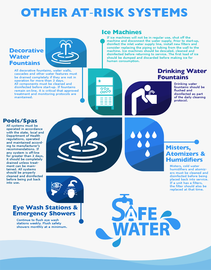 During this time when so many facilities are empty or at reduced capacity, both our domestic water and utility (HVAC and boiler) systems are used less than normal. The reduction in normal operating capacity and normal water flow, results in stagnant water conditions that allow for potentially harmful bacteria such as Legionella, mycobacteria and other water‐borne pathogens to grow in both our domestic and utility water systems. These stagnant water conditions may also promote corrosion, scale formation, and bacteria growth that inhibits heat transfer, resulting in an increase in operating costs. As people come back to work, they will potentially be exposed to the bacteria in the water system if proactive measures are not taken to ensure the safety of those systems. We also need to ensure that the systems that we rely on for heating and cooling will operate effectively and efficiently without any damage to these systems during the slowdown in normal operation.
